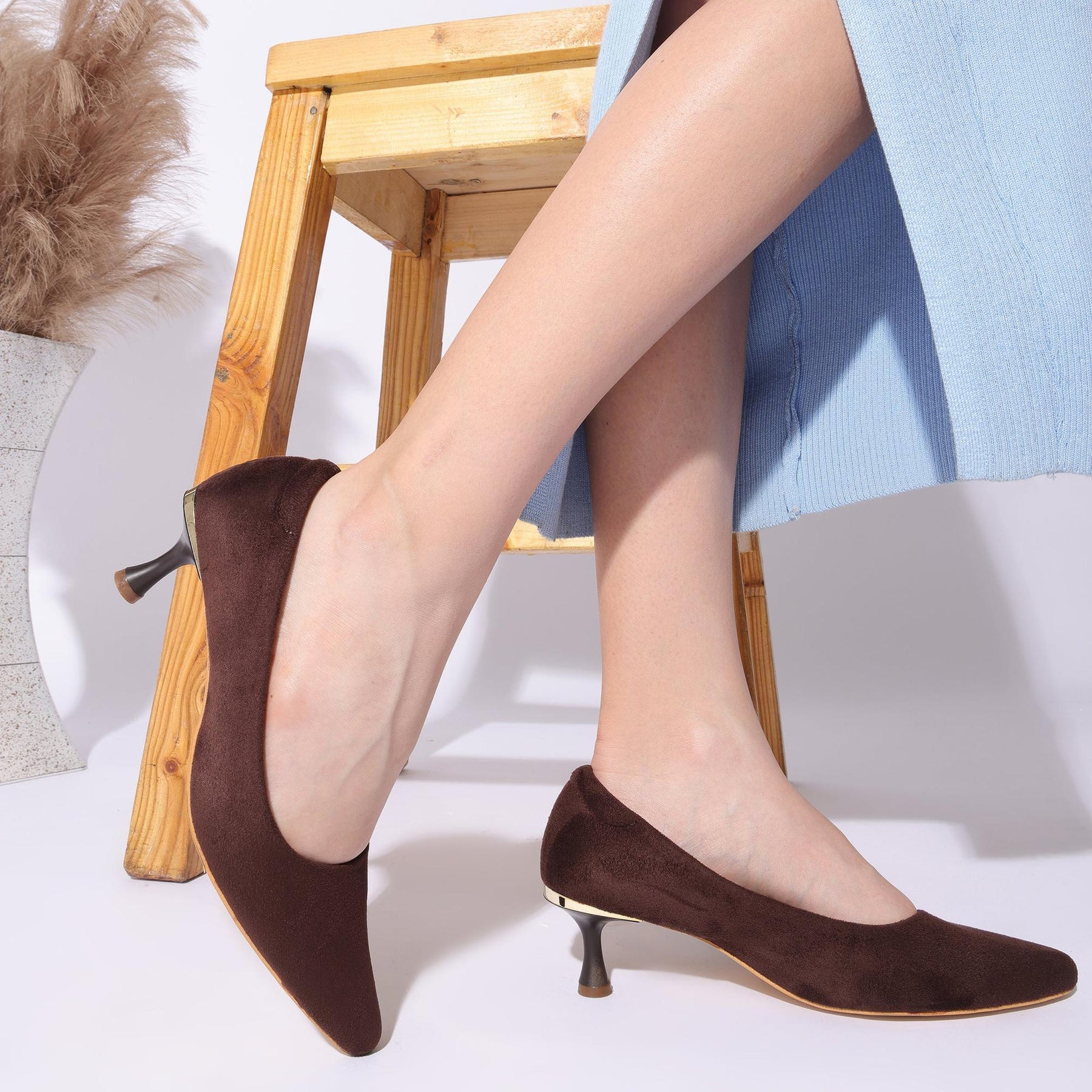 Command attention in the office with these dark brown suede pumps. The medium Louis heel and pointed toe design exude sophistication, perfect for workwear and everyday office attire. The matte finish and solid pattern create a timeless look, while the slip-on style ensures easy wear. These versatile pumps will become your go-to choice for professional elegance.