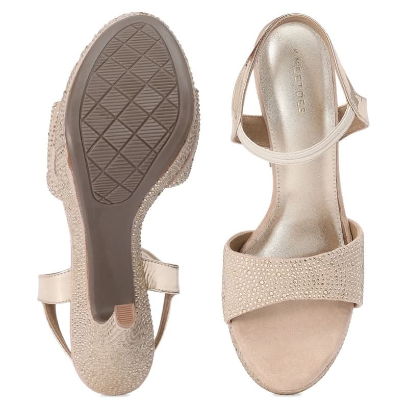 Dazzle at your next cocktail party with these stunning Kneetoes gold sandals. Featuring a stiletto heel and open-toe design, these embellished beauties are adorned with exquisite stone work. The sleek and stylish design offers both glamour and comfort, making them the perfect choice for a night out. Elevate your cocktail attire with these head-turning sandals.